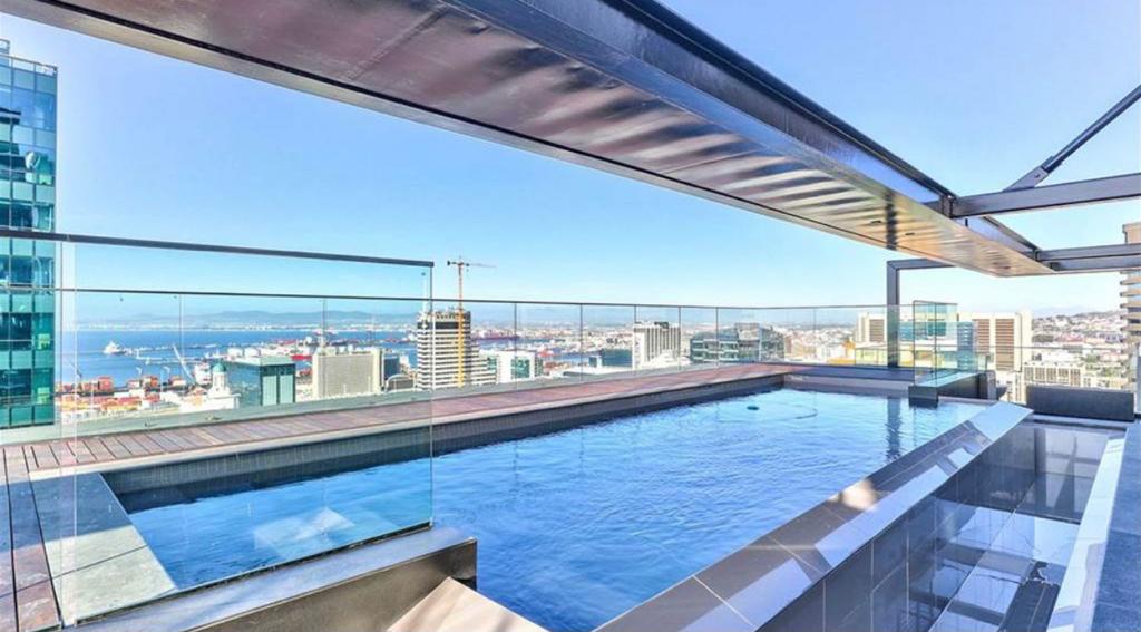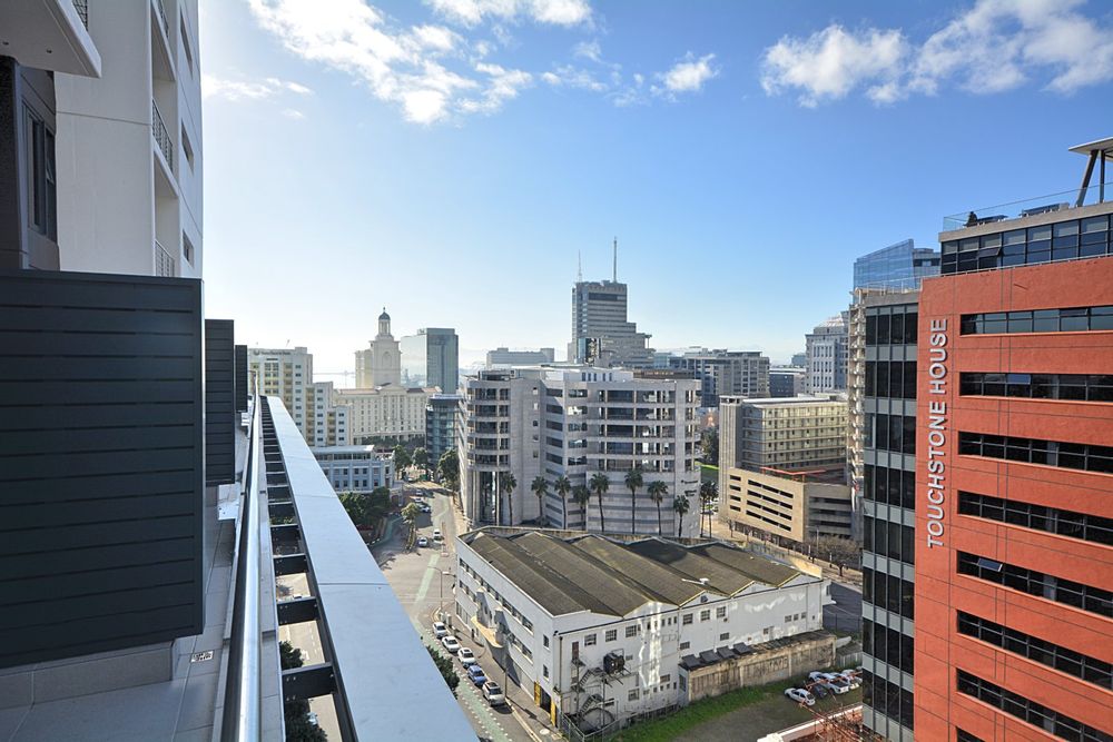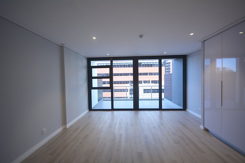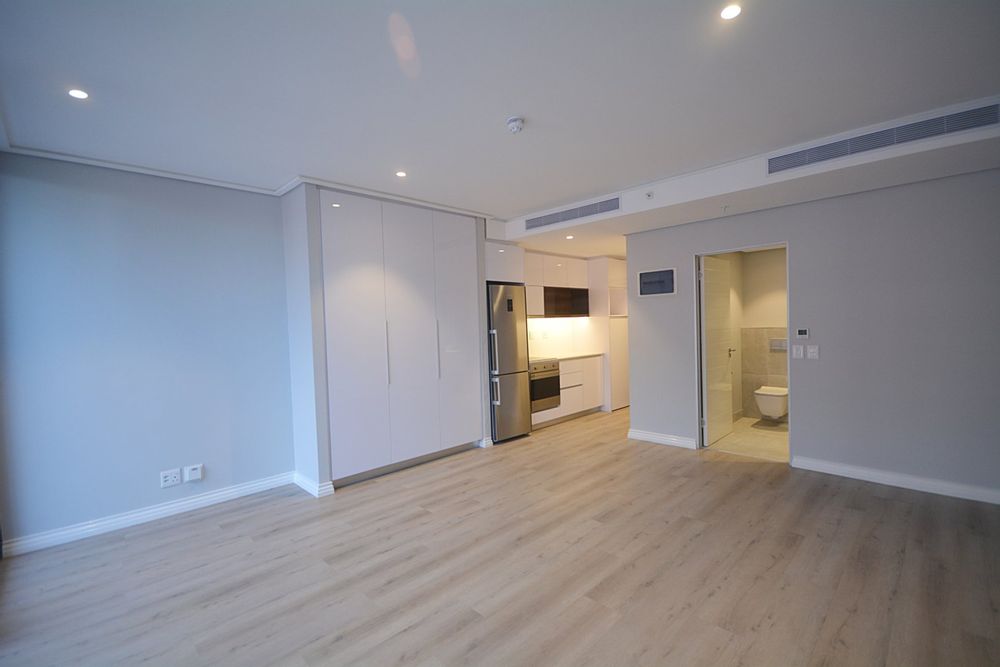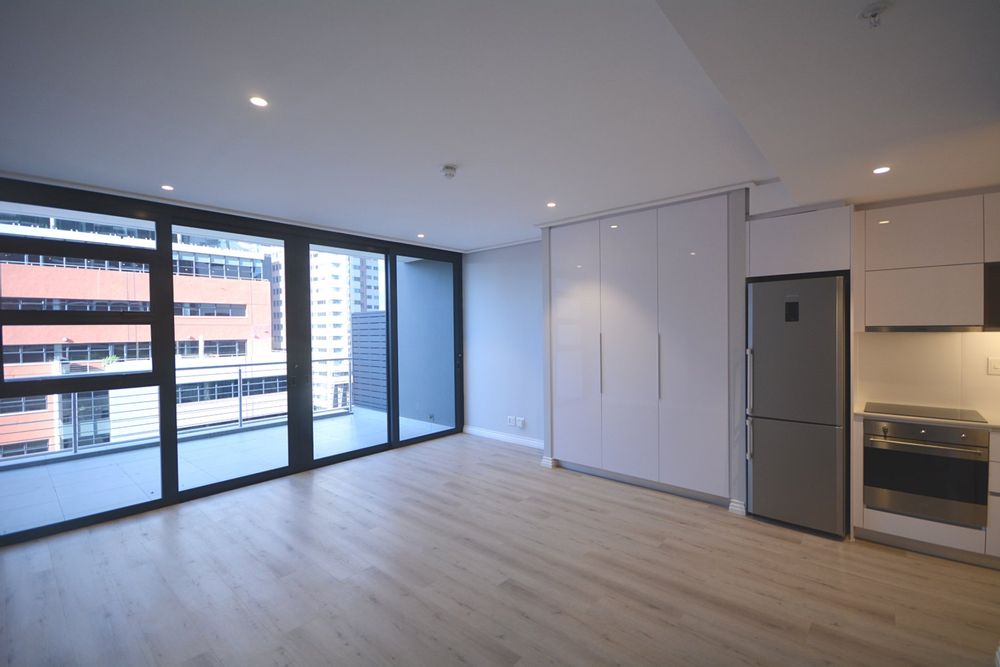Located on the 12th floor, this beautiful stylish 51m2 unfurnished larger studio apartment features panoramic views of Table Mountain and the city landscape. Brand new and finished with high-quality finishes throughout and central air-conditioning. Open plan kitchen area with loads of natural light. The apartment comes with Smeg appliances; washer/Dryer combo, Fridge, Dishwasher, oven & stove combo. Electricity is Pre-Paid for the tenants account (Nusco Digital Utility App). The landlord has also installed curtains in this property and it comes with 1x secure parking bay.