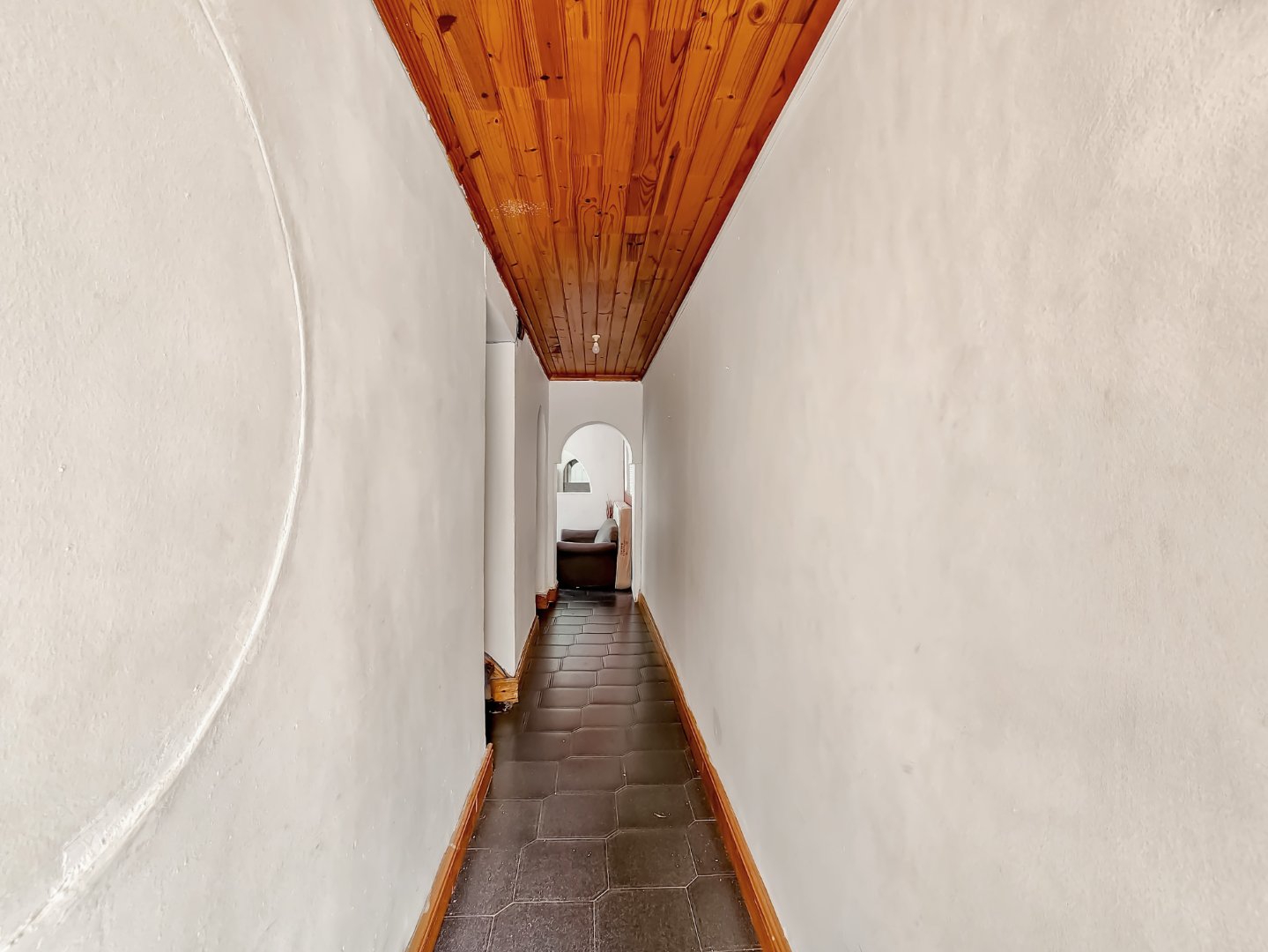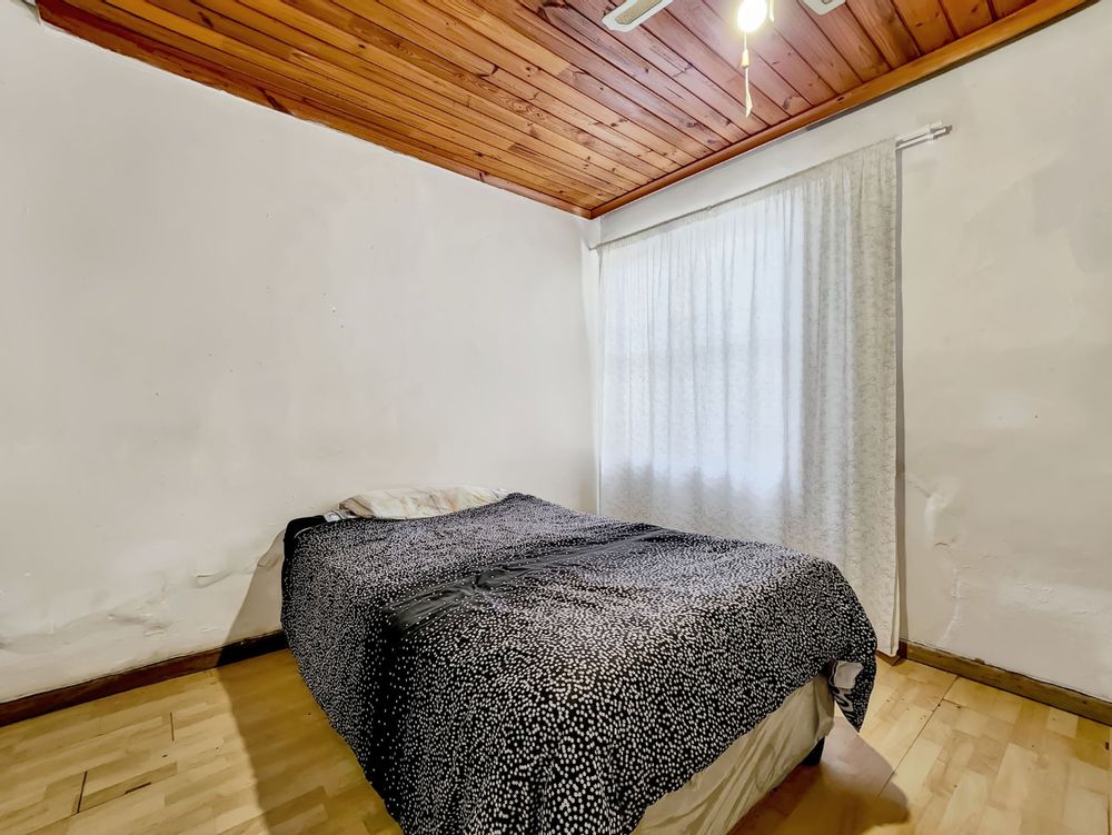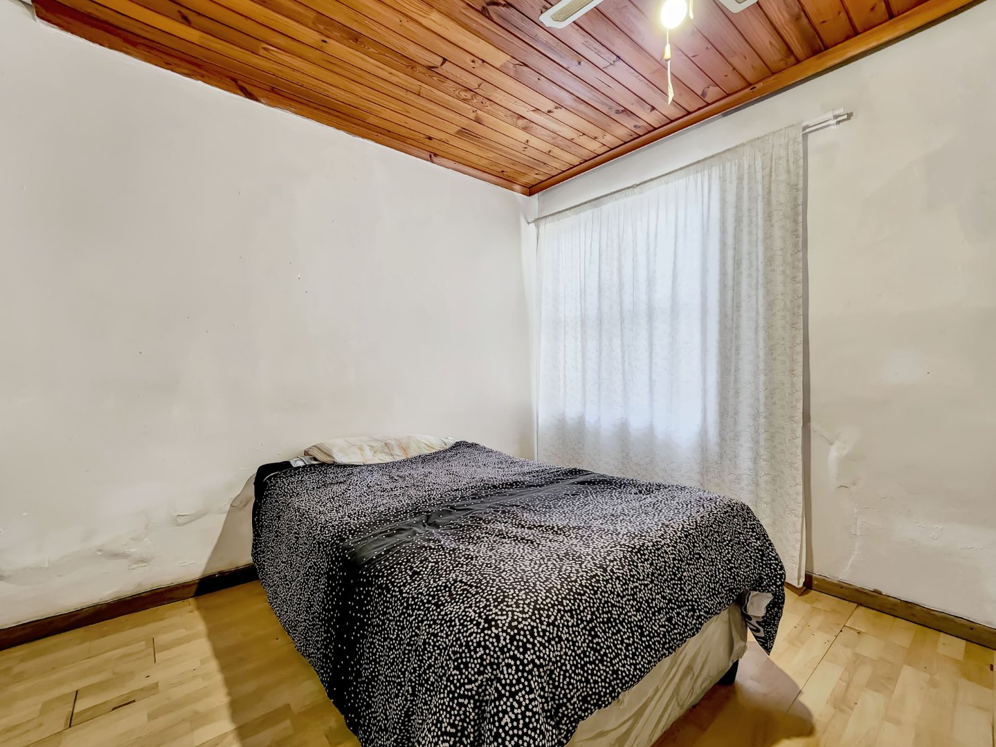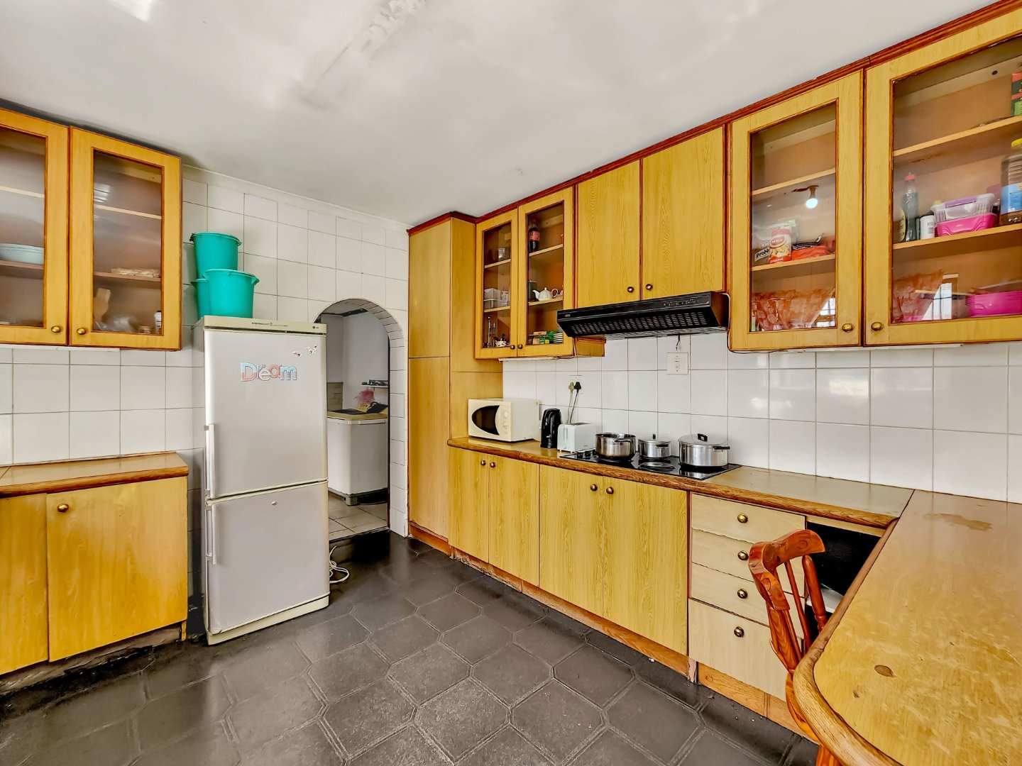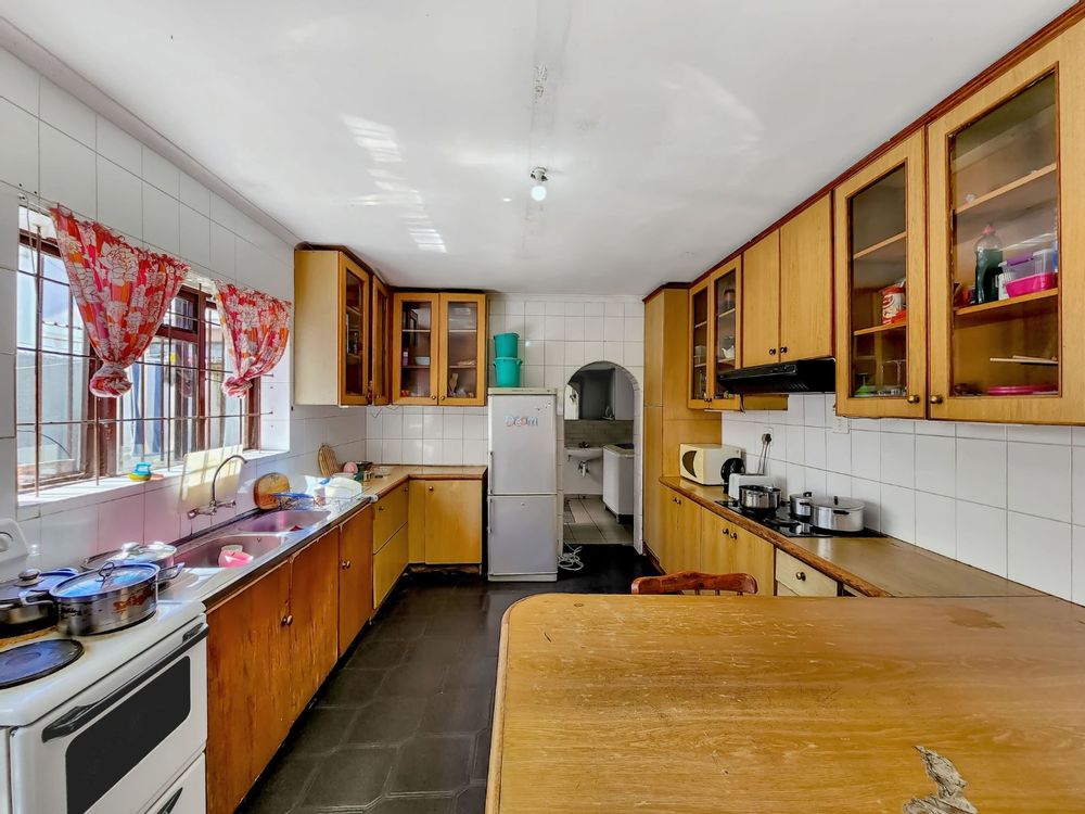 The kitchen boasts ample cupboard space, plumbing points, and wooden countertops. Throughout the property, the traditional wooden finishes and lofty ceilings create a warm and inviting ambiance.
