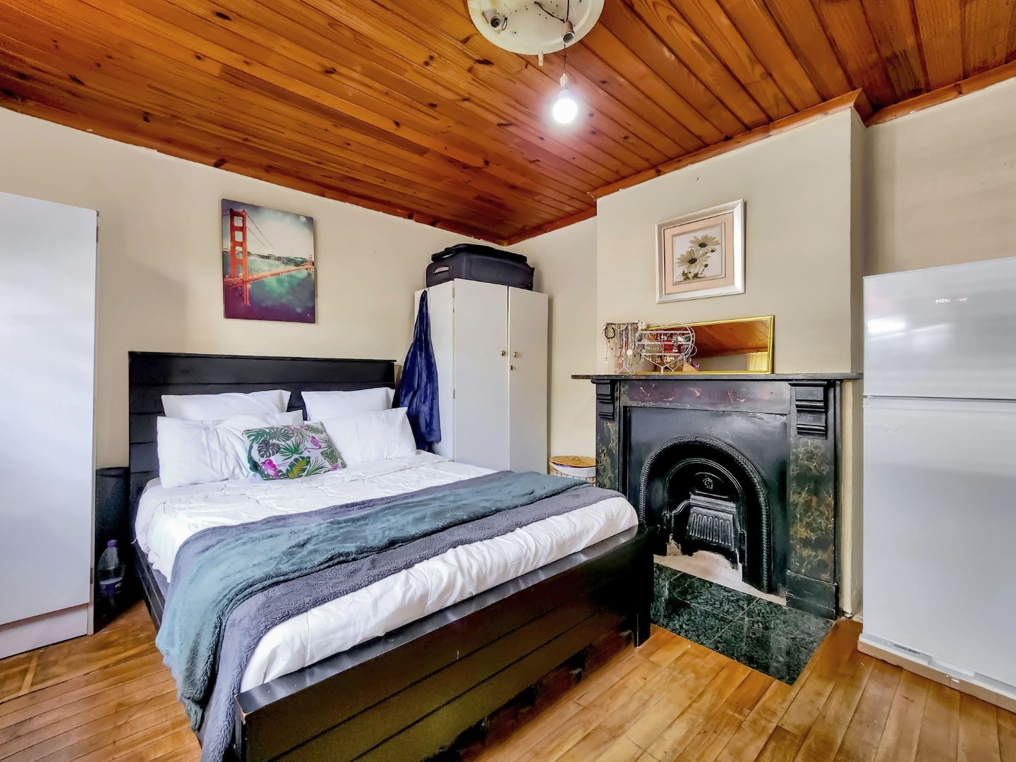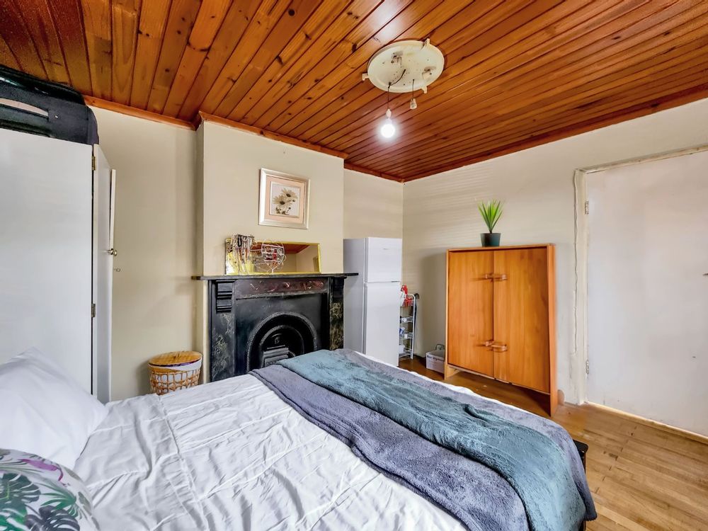 Step into a spacious semi-open-plan lounge, dining, and kitchen area adorned with traditionally wooden finishes and high ceilings, evoking the charm of a vibrant Victorian home. The generously sized bedrooms feature wooden flooring, complemented by a well-appointed bathroom.