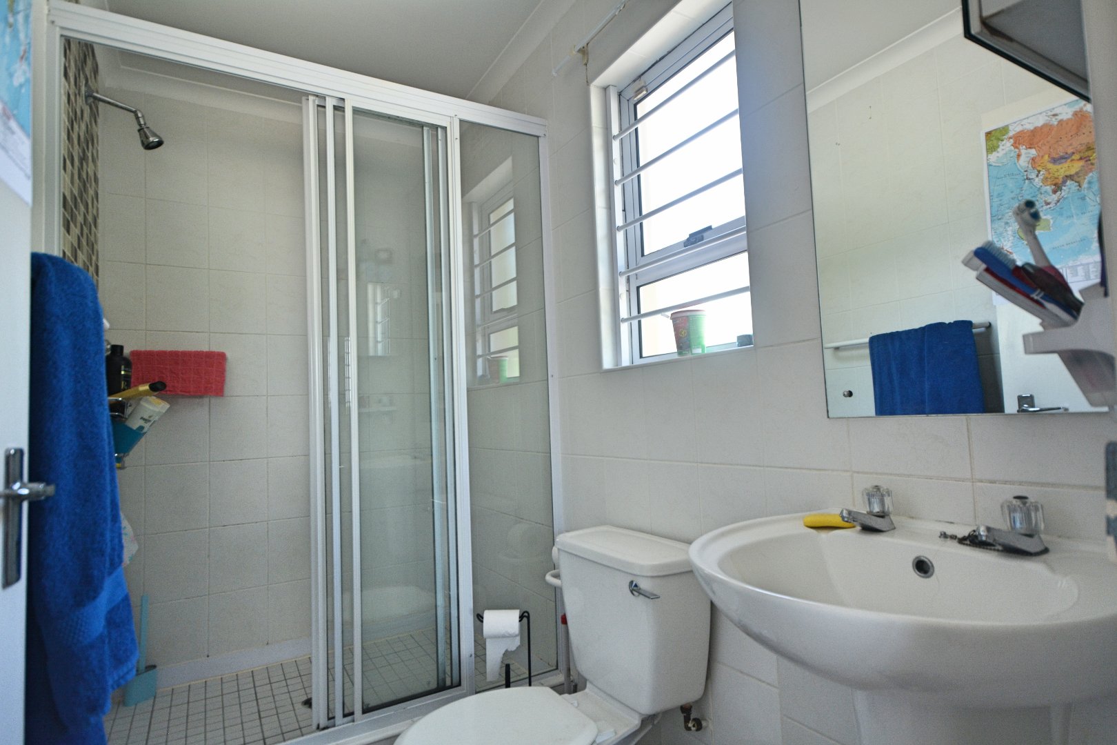 - Two bathrooms, one ensuite and a second bathroom with a bath, toilet, and basin