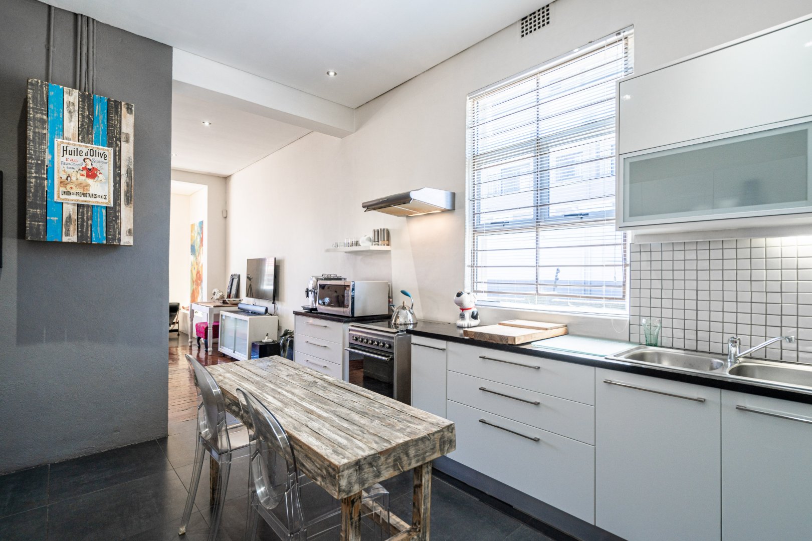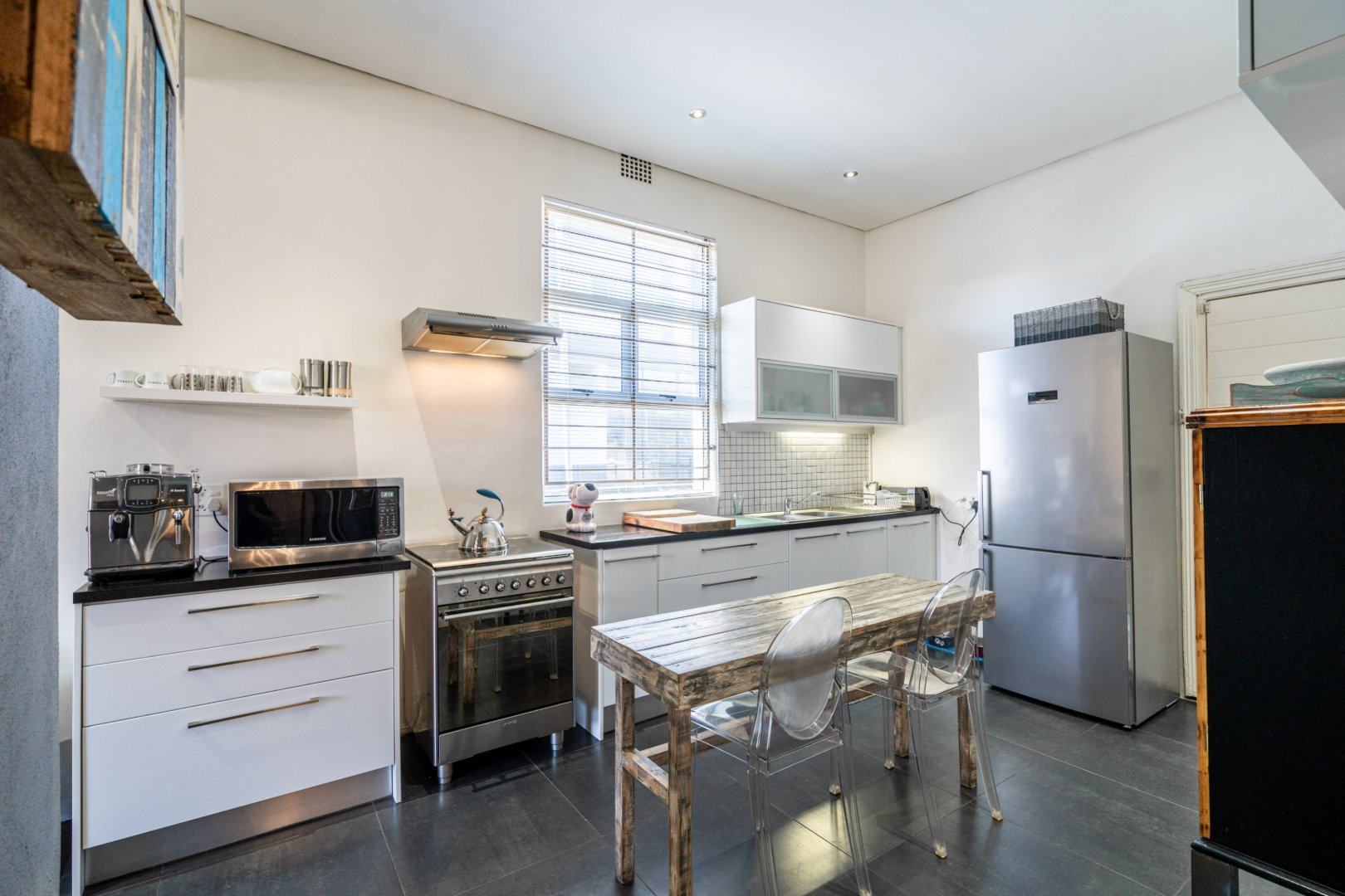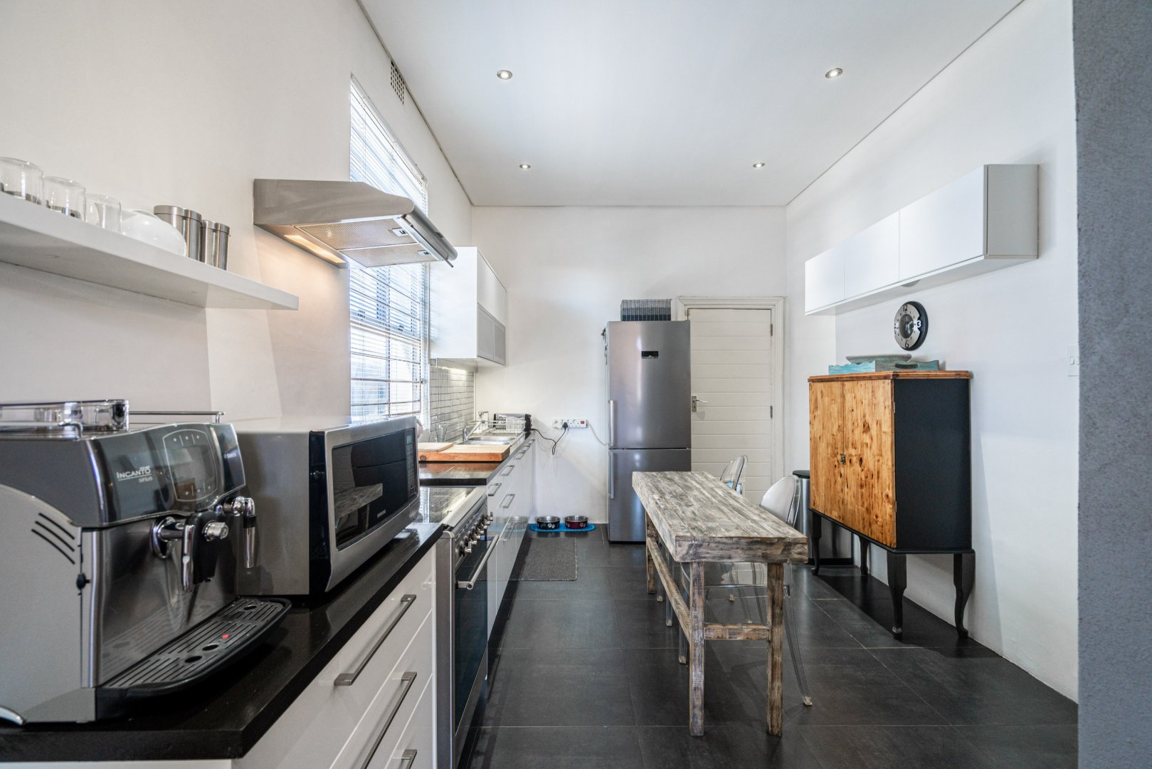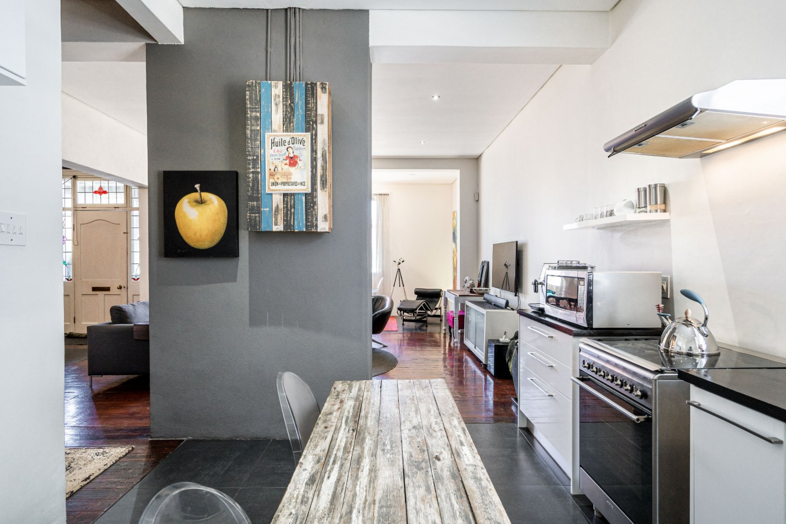 The heart of the residence is a spacious open-plan lounge and dining area with the original wood-burning fireplace. Leading into a modern kitchen area that includes dark Mahogany wood countertops, soft-closing drawers, and a gas hob with an extractor fan.