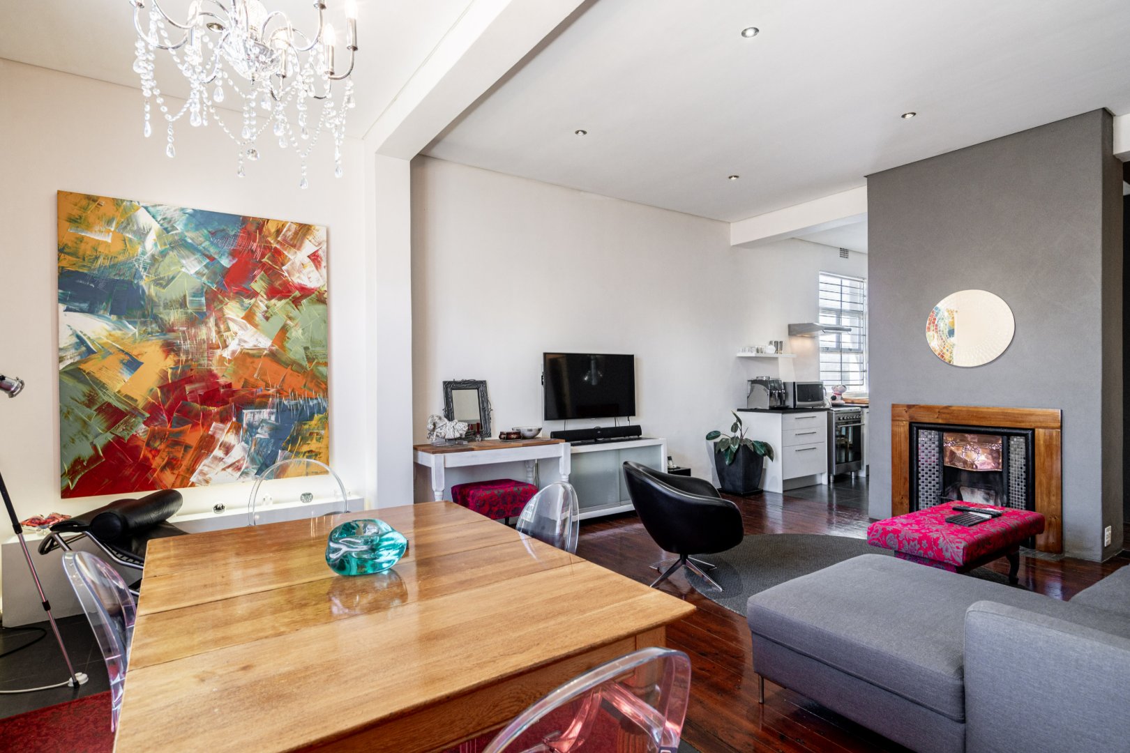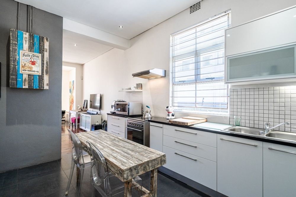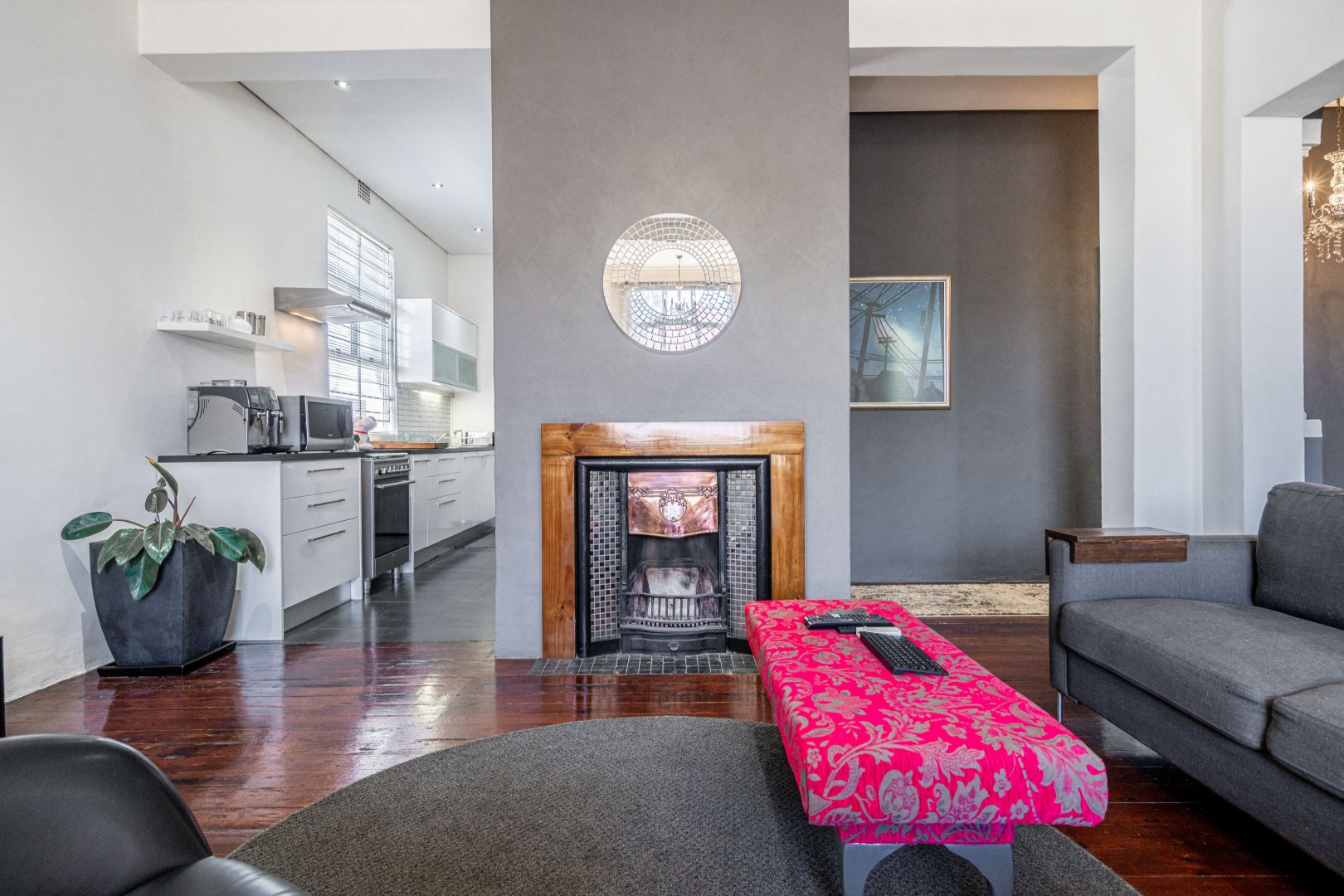 The heart of the residence is a spacious open-plan lounge and dining area with the original wood-burning fireplace. Leading into a modern kitchen area that includes dark Mahogany wood countertops, soft-closing drawers, and a gas hob with an extractor fan.