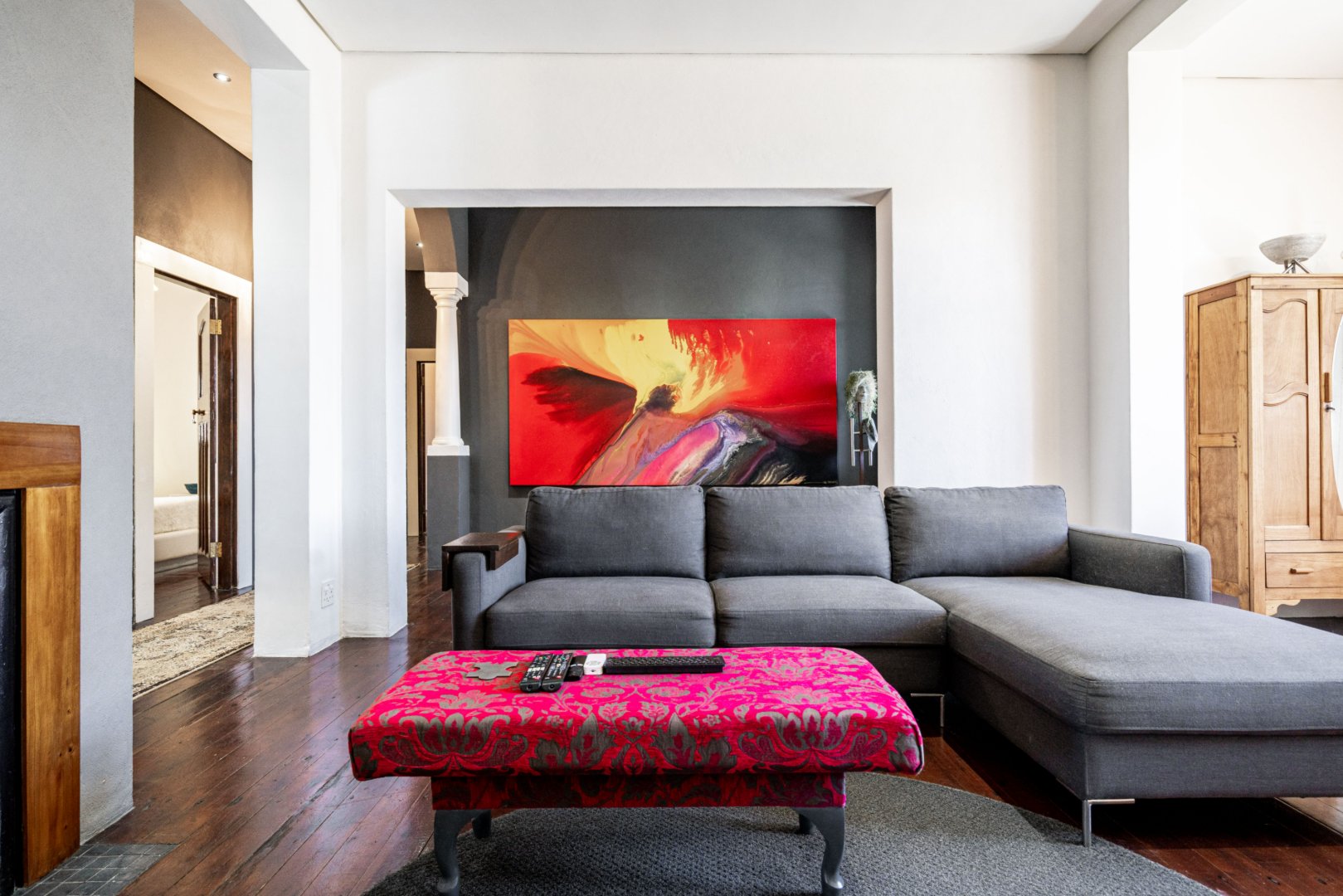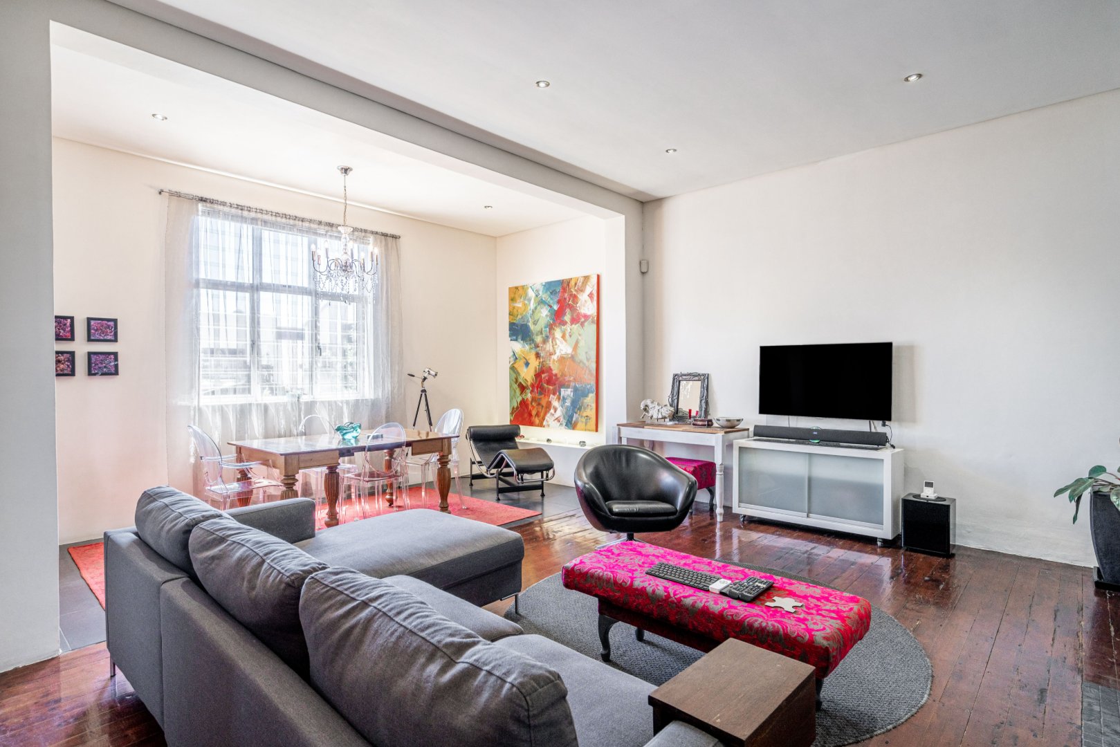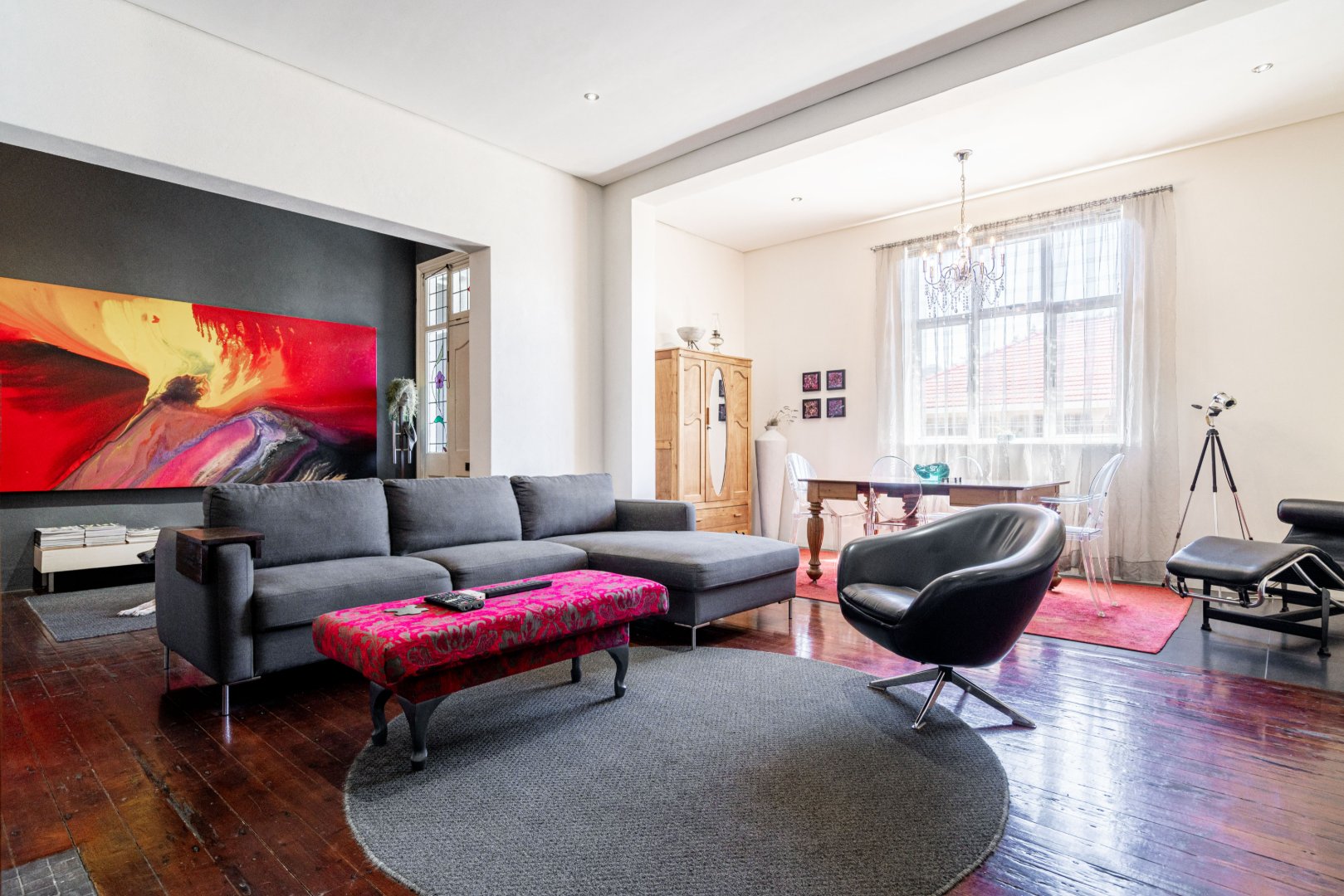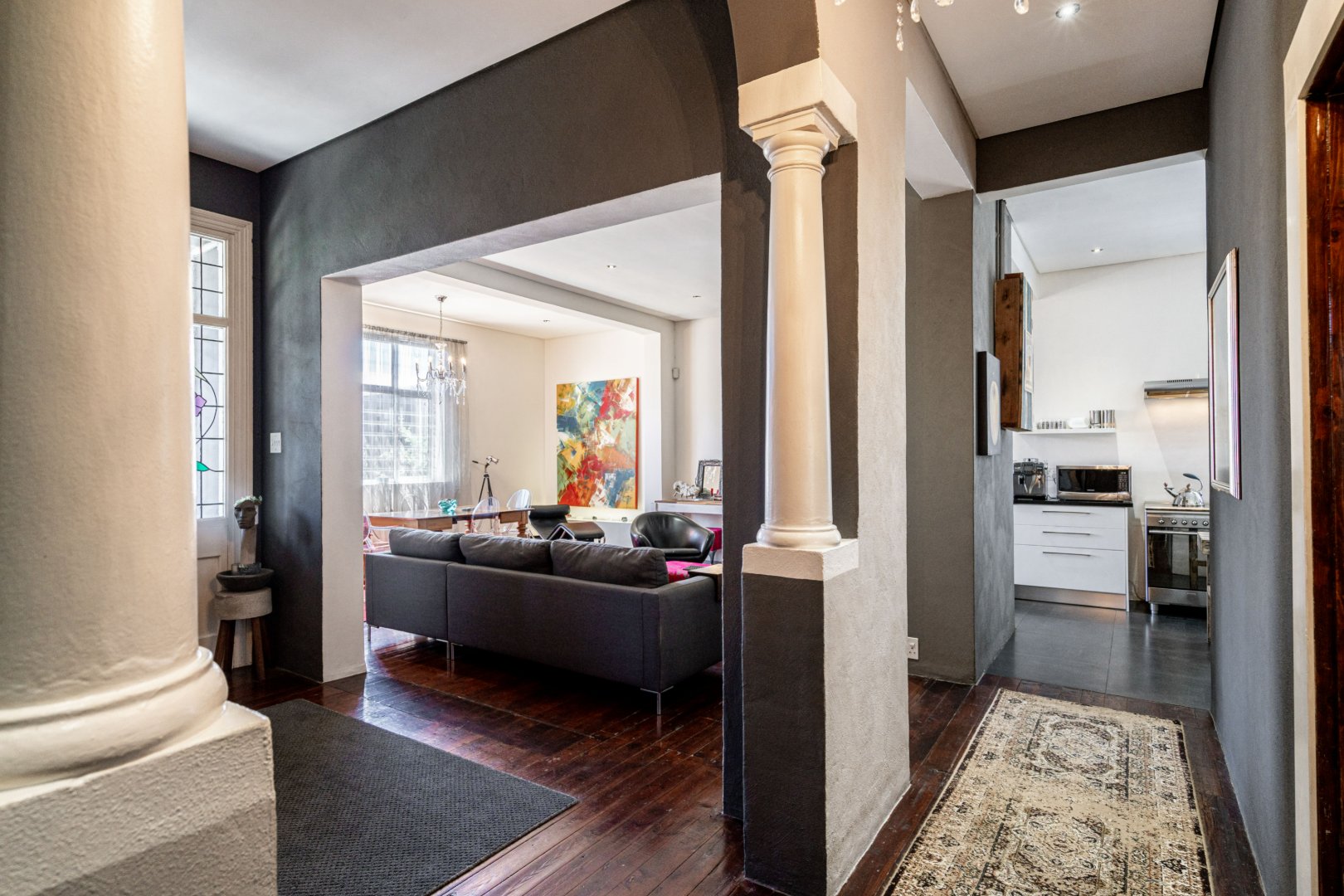 The heart of the residence is a spacious open-plan lounge and dining area with the original wood-burning fireplace. Leading into a modern kitchen area that includes dark Mahogany wood countertops, soft-closing drawers, and a gas hob with an extractor fan.