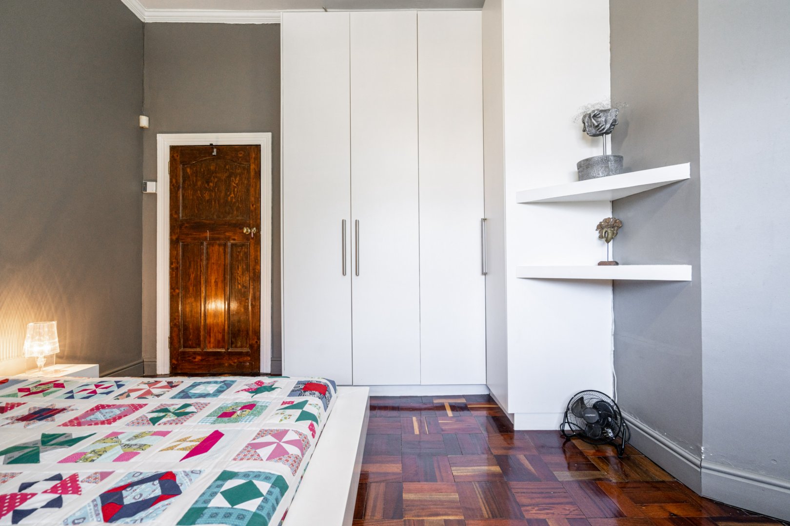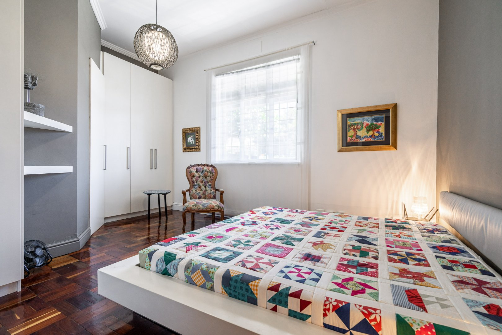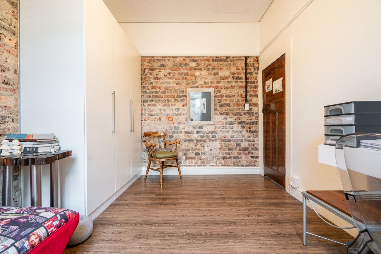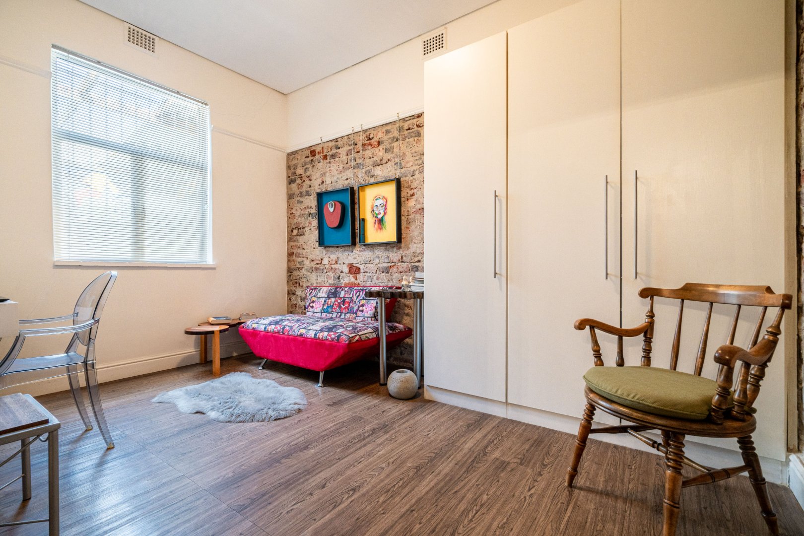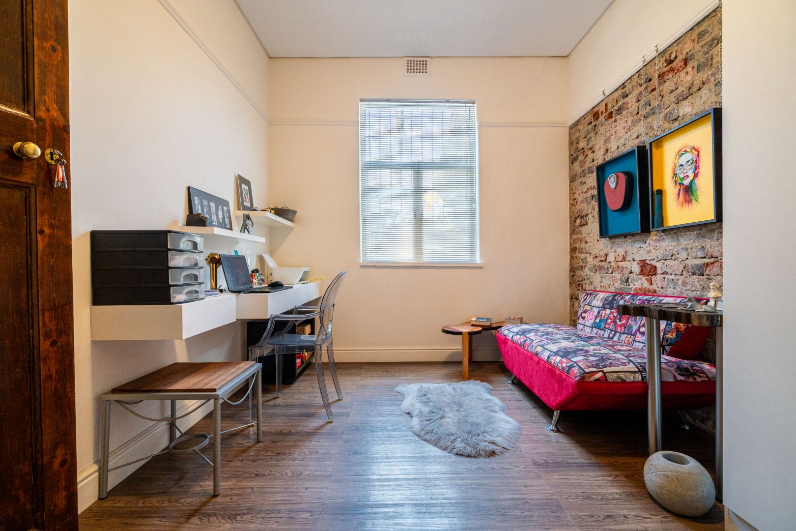 Both master bedroom and spare bedrooms host unique features from stylish and custom en-suites, large built-in cupboards, and large framed windows for ample natural light throughout the day. The 3rd bedroom has a floating desk and shelves with an exposed face brick wall and could be converted to make an ideal work-from-home space or nursery.