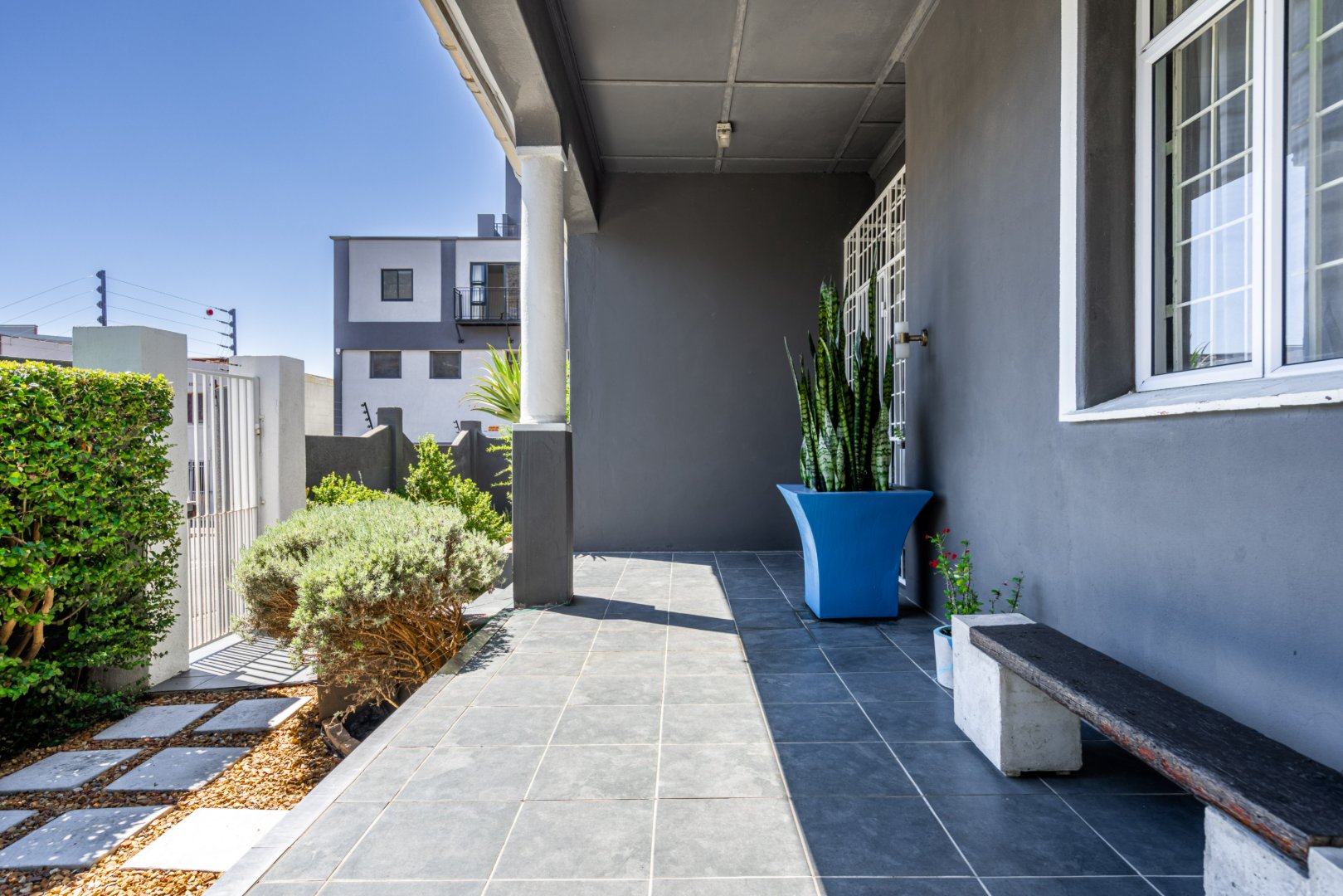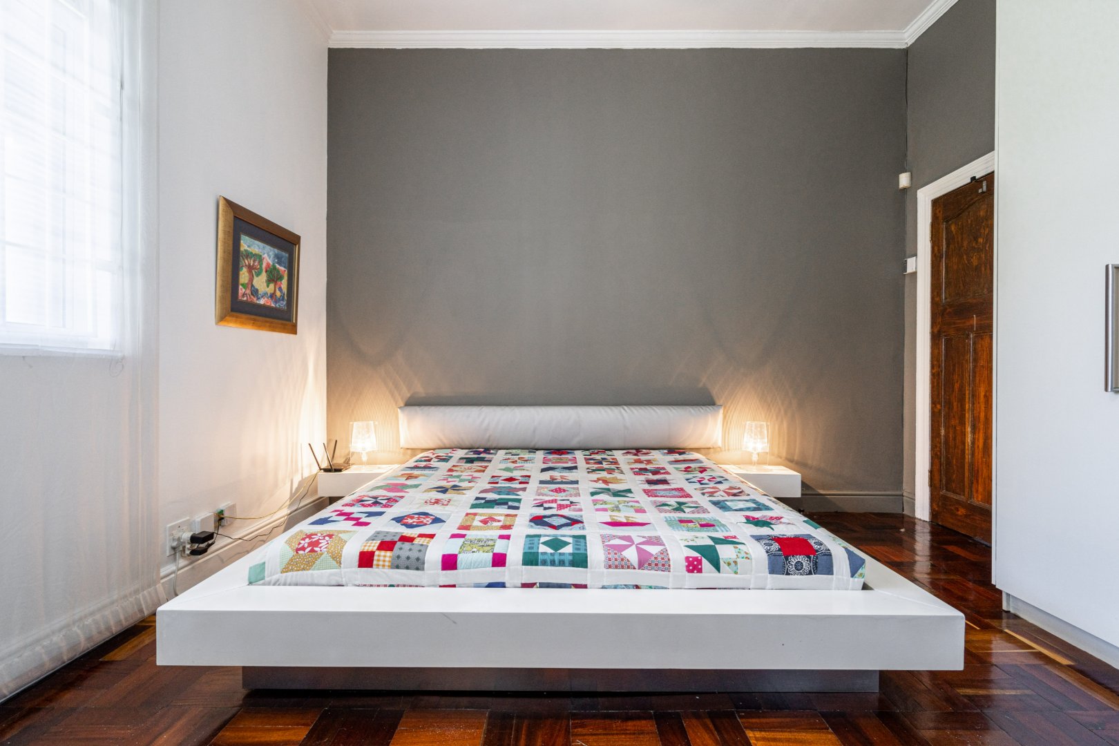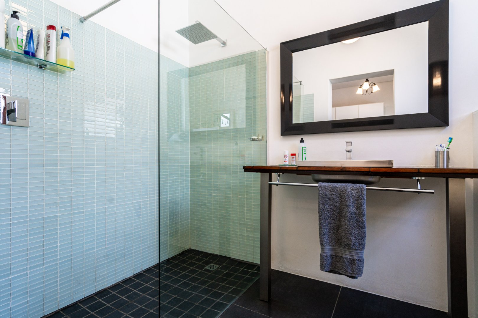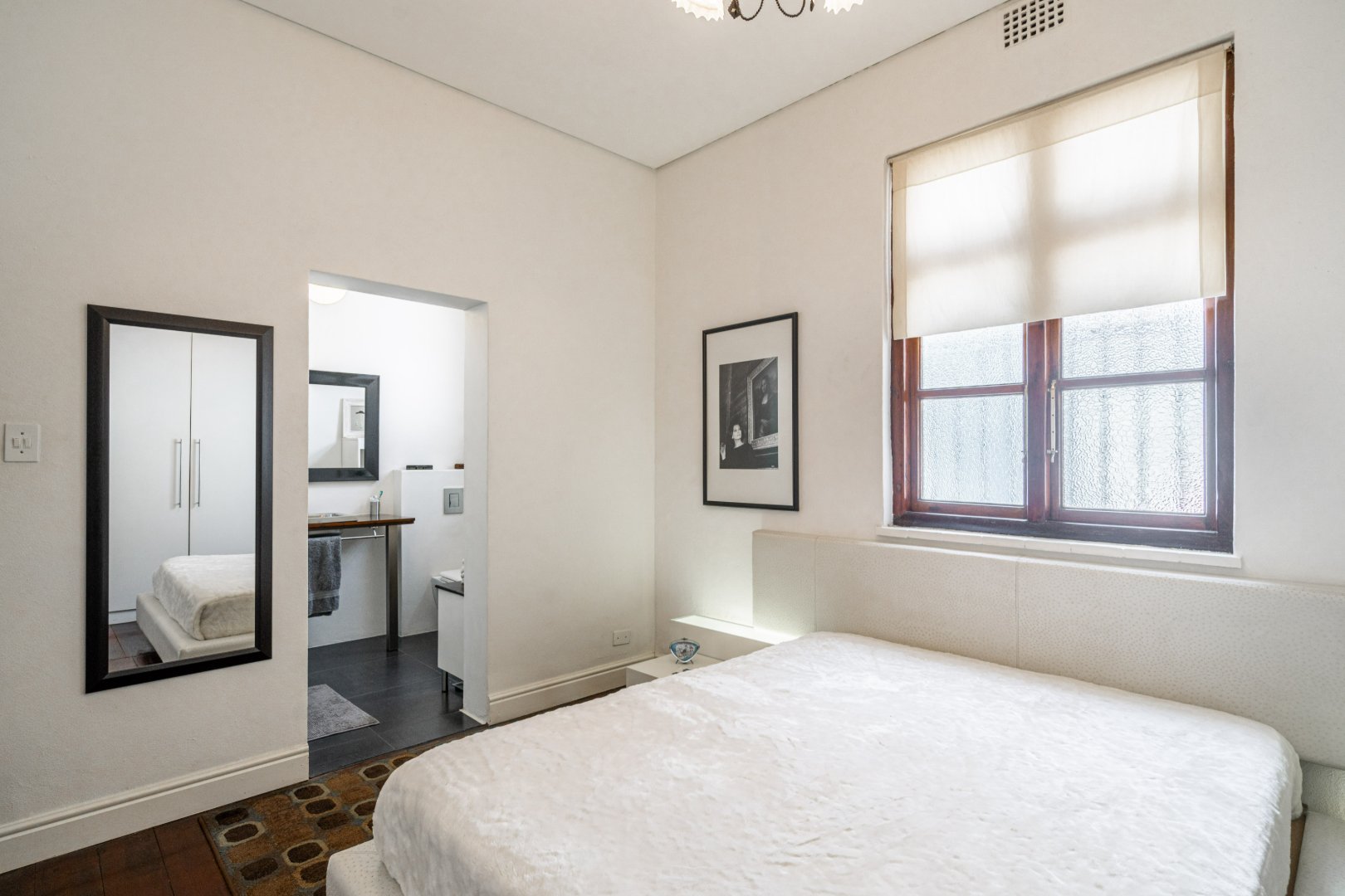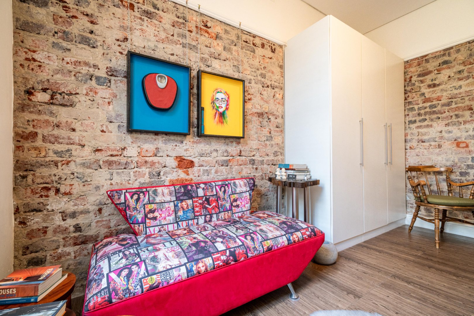 Both master bedroom and spare bedrooms host unique features from stylish and custom en-suites, large built-in cupboards, and large framed windows for ample natural light throughout the day. The 3rd bedroom has a floating desk and shelves with an exposed face brick wall and could be converted to make an ideal work-from-home space or nursery.