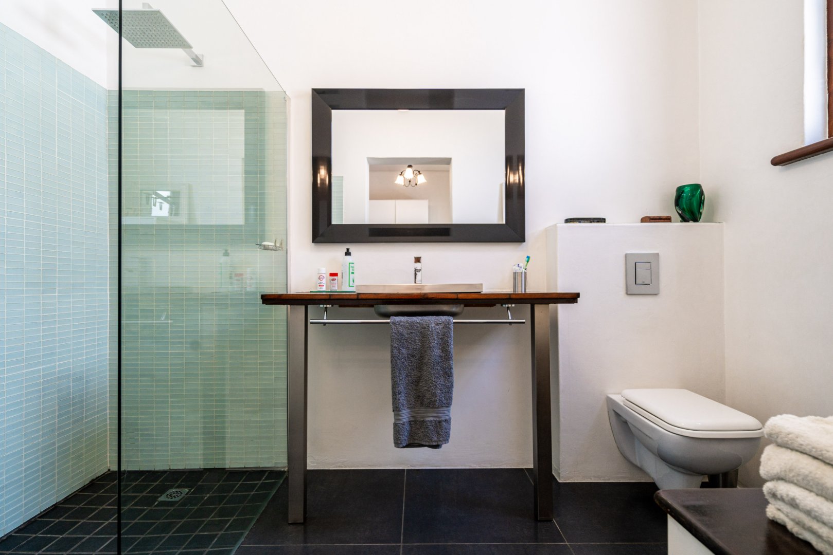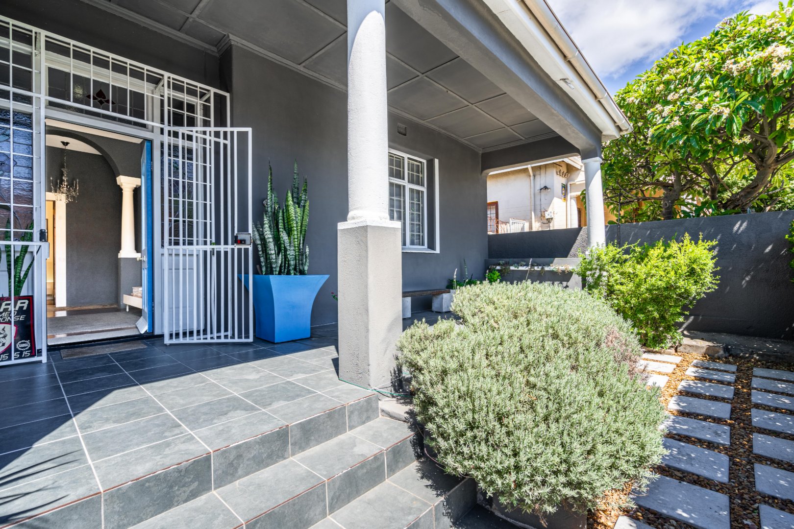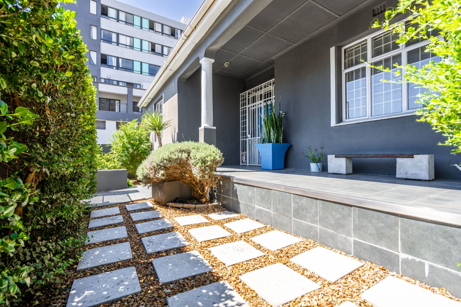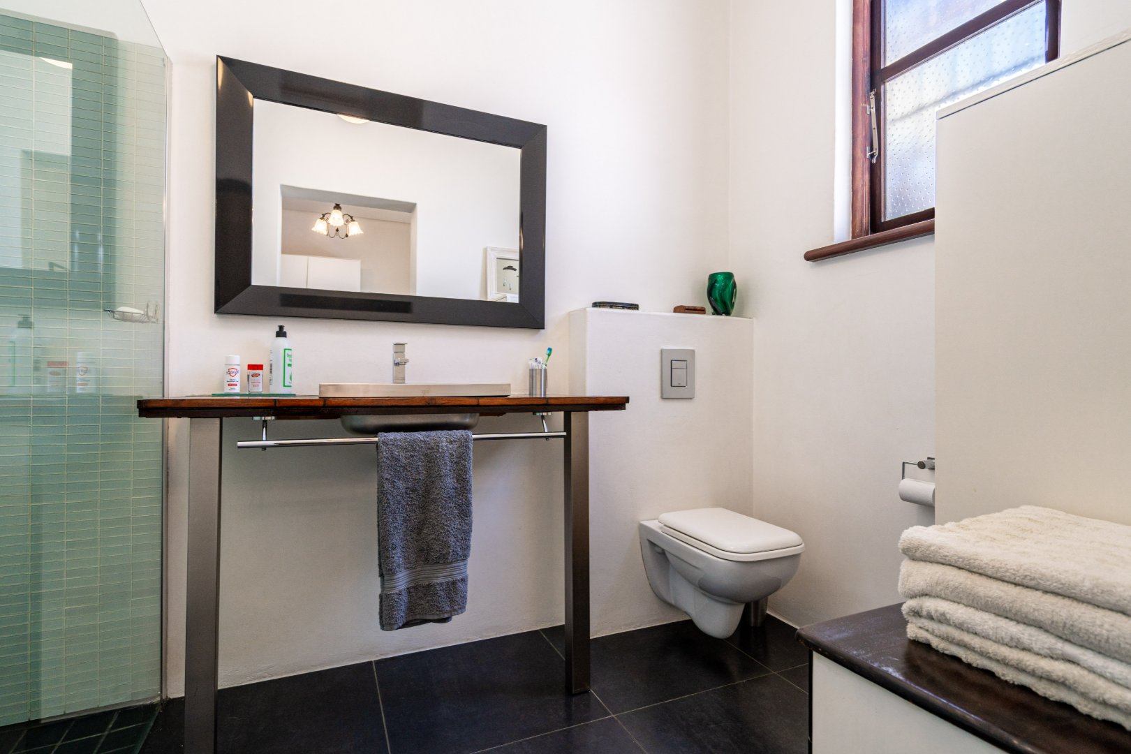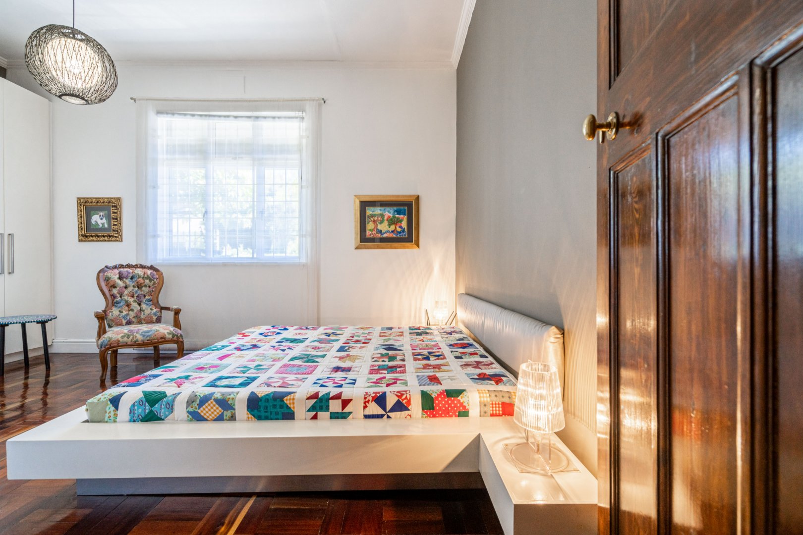 Both master bedroom and spare bedrooms host unique features from stylish and custom en-suites, large built-in cupboards, and large framed windows for ample natural light throughout the day. The 3rd bedroom has a floating desk and shelves with an exposed face brick wall and could be converted to make an ideal work-from-home space or nursery.