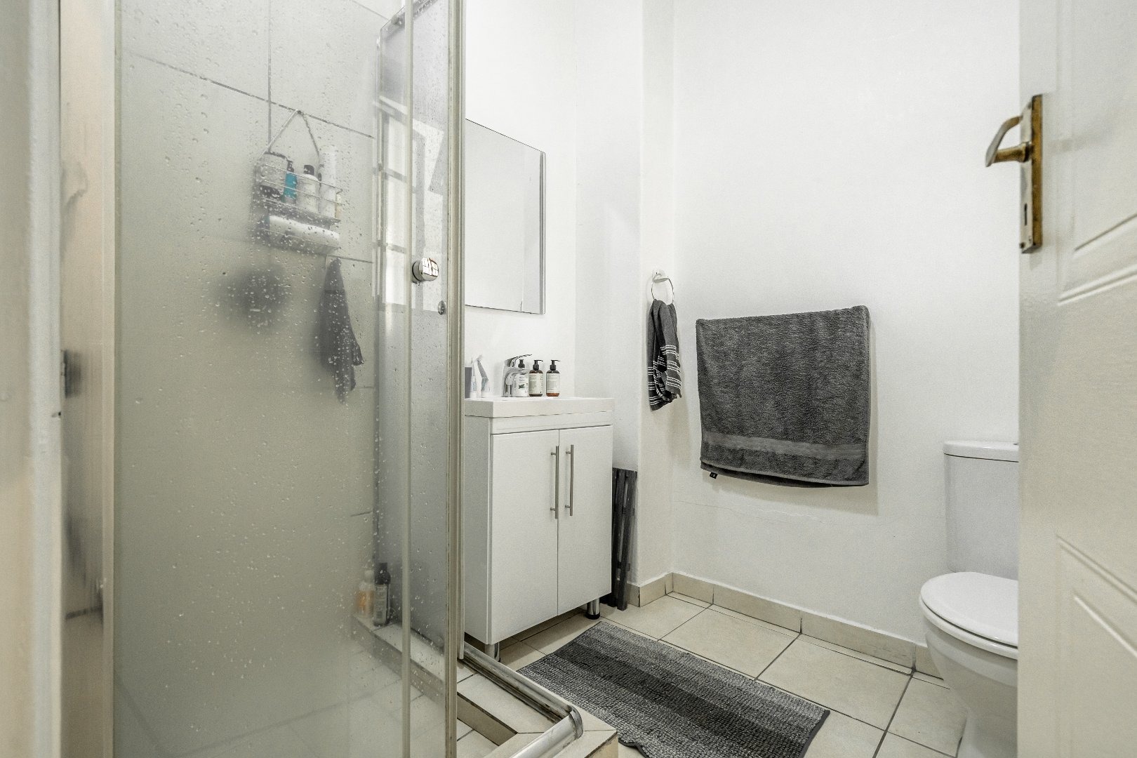 The apartment has an open-plan kitchen and living area that allows an abundance of natural light to flow through multiple windows and the sliding door. The main living area features laminate flooring as well as built-in-cupboards (BIC's), providing plenty of storage. The kitchen is equipped with a granite countertop, a double sink, spacious BIC’s, an oven and electric stovetop, and plumbing for a dishwasher or washing machine.